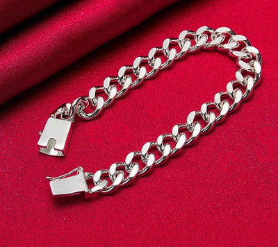 Crafted with 925 sterling silver, this 10mm beveled Cuban link bracelet is a must-have for any jewelry collection. Its versatile unisex design makes it a stylish accessory for any occasion, and its sturdy construction ensures it will withstand the test of time. Elevate your look and show off your unique style with this stunning piece.